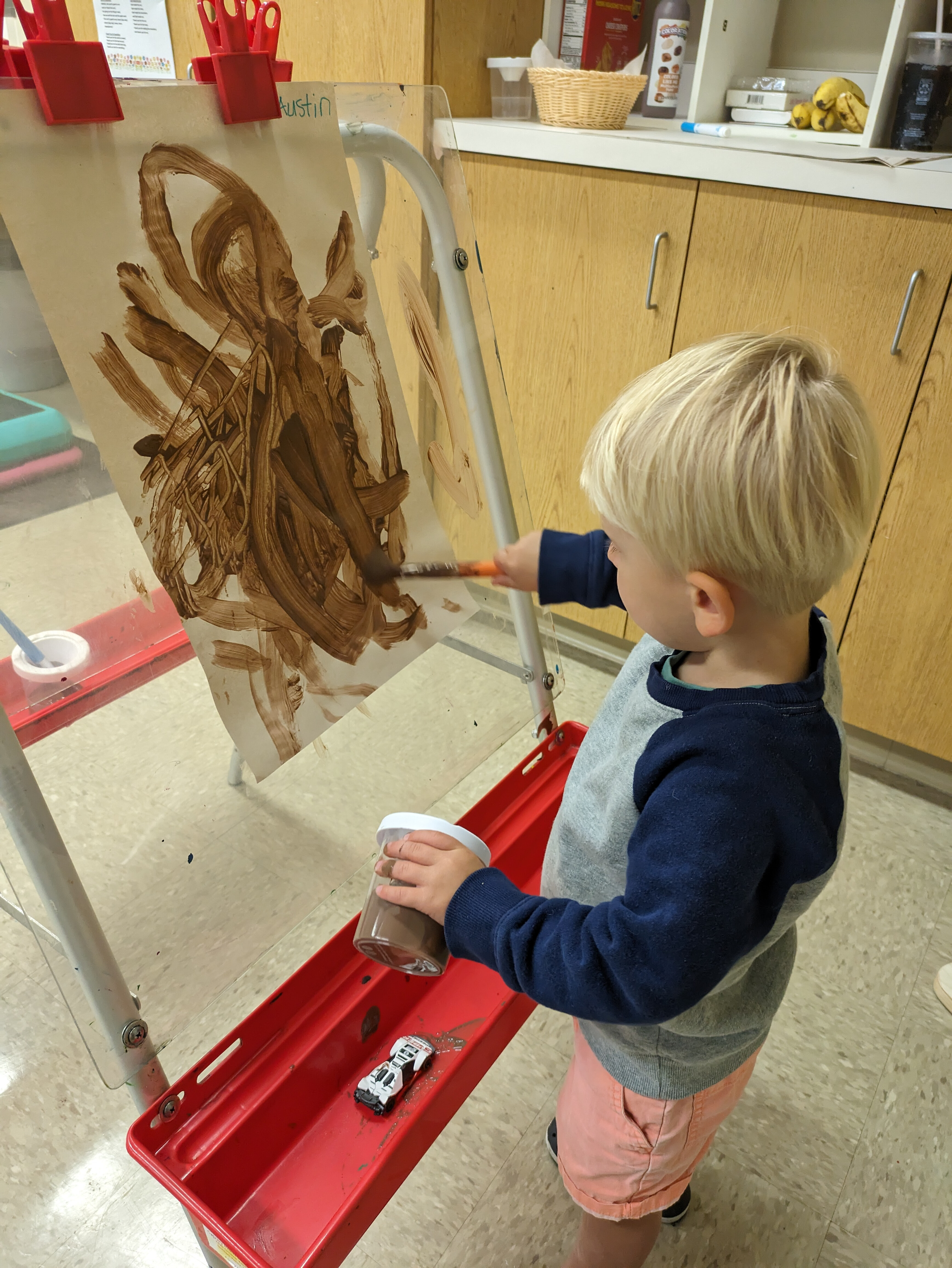 All children participate in daily art activities through which they create their own masterpieces, develop fine-motor skills, acquire skills in independence (i.e., dress themselves in smocks, clean up) and explore current educational themes further.